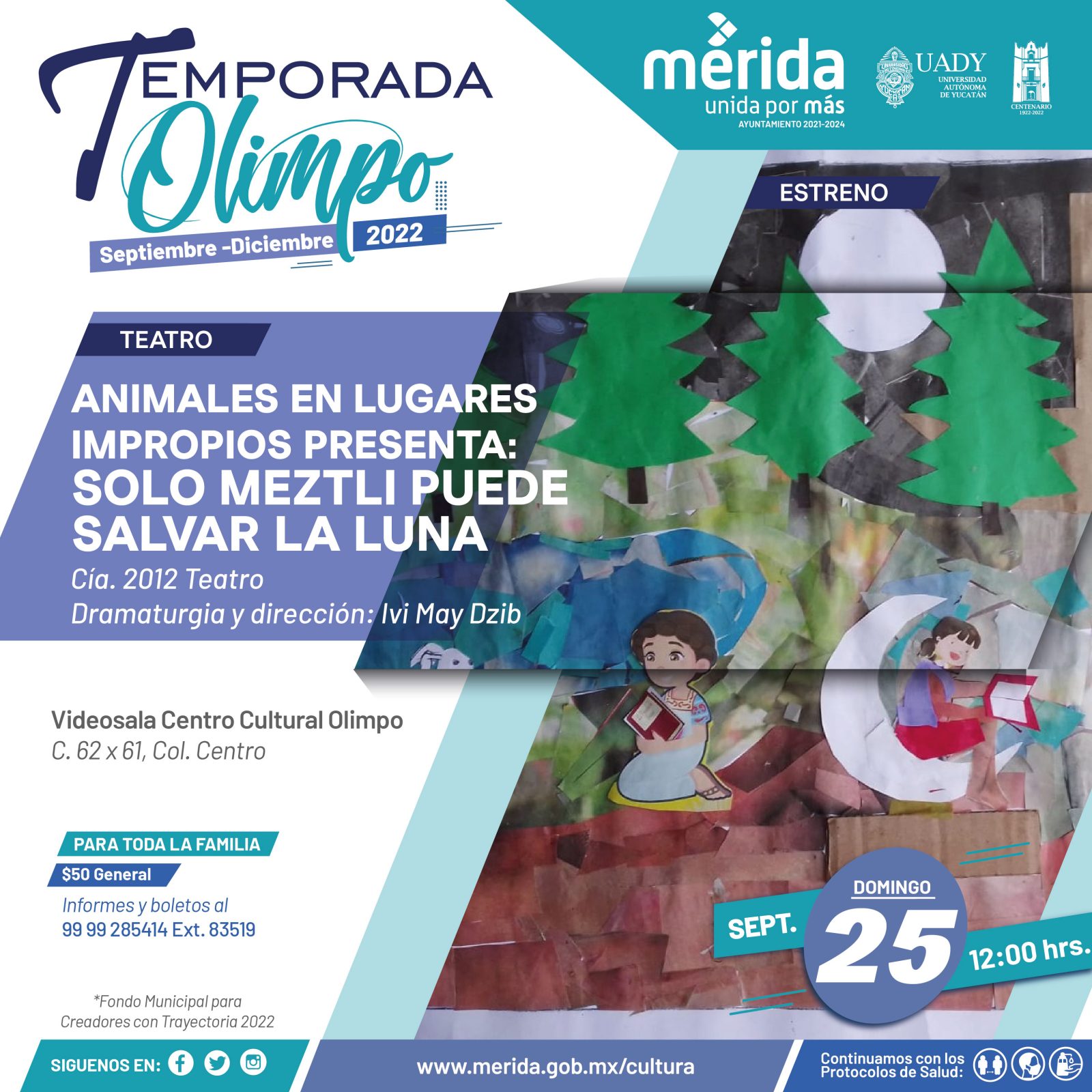 Este domingo 25 de septiembre a las 12:00 horas, en la Videosala del Centro Cultural Olimpo, se llevará a cabo la última función de la obra “Animales en lugares impropios PRESENTA: Solo Meztli puede salvar la luna”, un proyecto apoyado por el Fondo Municipal para Creadores con Trayectoria 2022 a través de la Dirección de Cultura del Ayuntamiento de Mérida. Es una obra para niñas y niños a partir de 5 años con una duración aproximada de 52 minutos, producida por la CIA. GRUPO 2012 TEATRO y la cual fue escrita y dirigida por Ivi May Dzib.