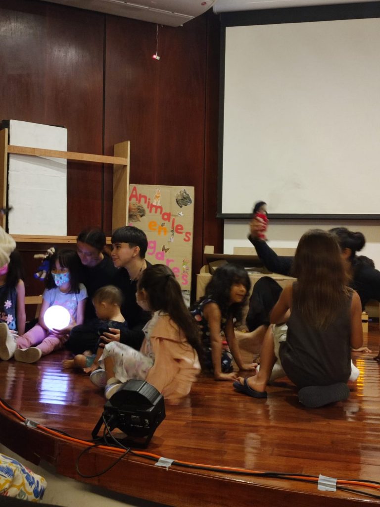 Al ser una obra de carácter narrativo, nos pareció importante que los libros jugaran un papel fundamental, ya que la historia está ambientada en una biblioteca, el cual es el refugio de la protagonista, por lo que pensamos que el uso de cuatro libros álbum de gran tamaño podría ser una manera de que el niño sintiera atracción por el libro físico. También pensamos que las lámparas en forma de libros y lunas podrían ayudarnos con la iluminación, al igual que las lámparas de mano que terminan siendo pequeños reflectores que sirvieron para iluminar de cerca a los personajes que son muñecas y muñecos amigurumis. La juguetería y manipulación de objetos nos da la sensación de niñas y niños que juegan y hablan con sus juguetes, lo que busca generar la sensación de reconocimiento entre las pequeñas y pequeños, ya que la actitud de niñas y niños frente al juego es muy parecida.