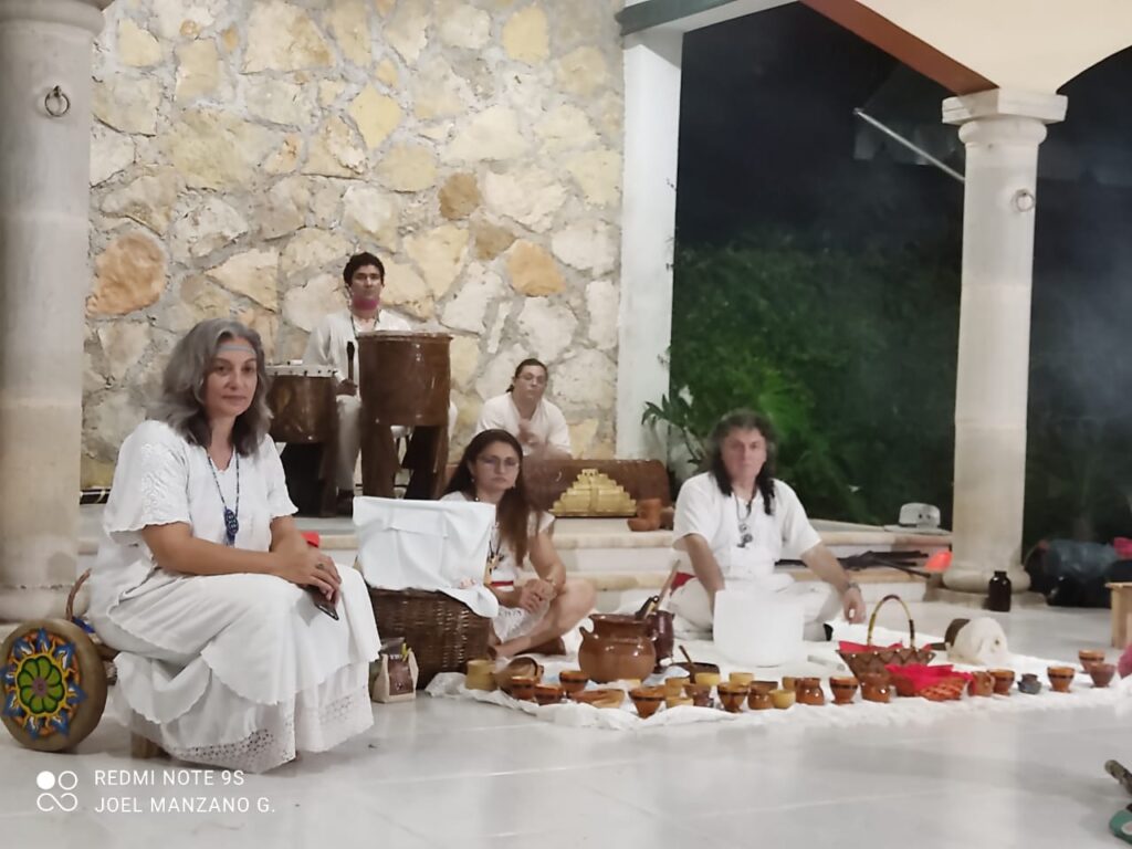 Los asistentes participaron, junto con los chamanes, curanderos y abuelas, en la ceremonia del fuego nuevo, dirigida por el j’men Valerio Canche Yah, para después pasar a la ceremonia del Cacao dirigida por Jorge Villanueva y María Aguilar, en la que también entregaron la pipa sagrada de los nativos americanos a ésta última y a Mónica Sinoe, abuela Ak’bal.