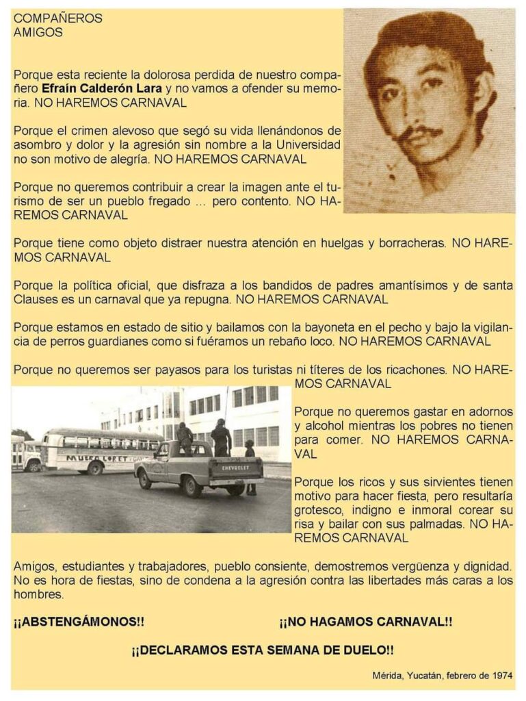 Lo anterior viene al caso al cumplirse el año 47 del secuestro-asesinato de Efraín Calderón Lara “Charras”, quien fuera líder sindical independiente en Yucatán, durante el movimiento sindicalista que emergió en los setenta del siglo pasado en México y que en el Estado tuvo sus momentos álgidos en 1973-74. Fue en ese marco de lucha proletaria-popular, cuando a raíz de la indignación y el dolor generado en el pueblo yucateco por el asesinato del “Charras”, acontecido entre el 13 y 14 de febrero de 1974, se tomó la decisión en la asamblea del movimiento y con el apoyo del pueblo, de no celebrar el carnaval de Mérida y sí reclamar justicia ante el crimen cometido por el gobierno de Carlos Loret de Mola, exigir el fin de la represión desatada en contra de los obreros-estudiantes-activistas del movimiento y luchar por el cumplimiento del pliego petitorio reclamado al gobierno.
