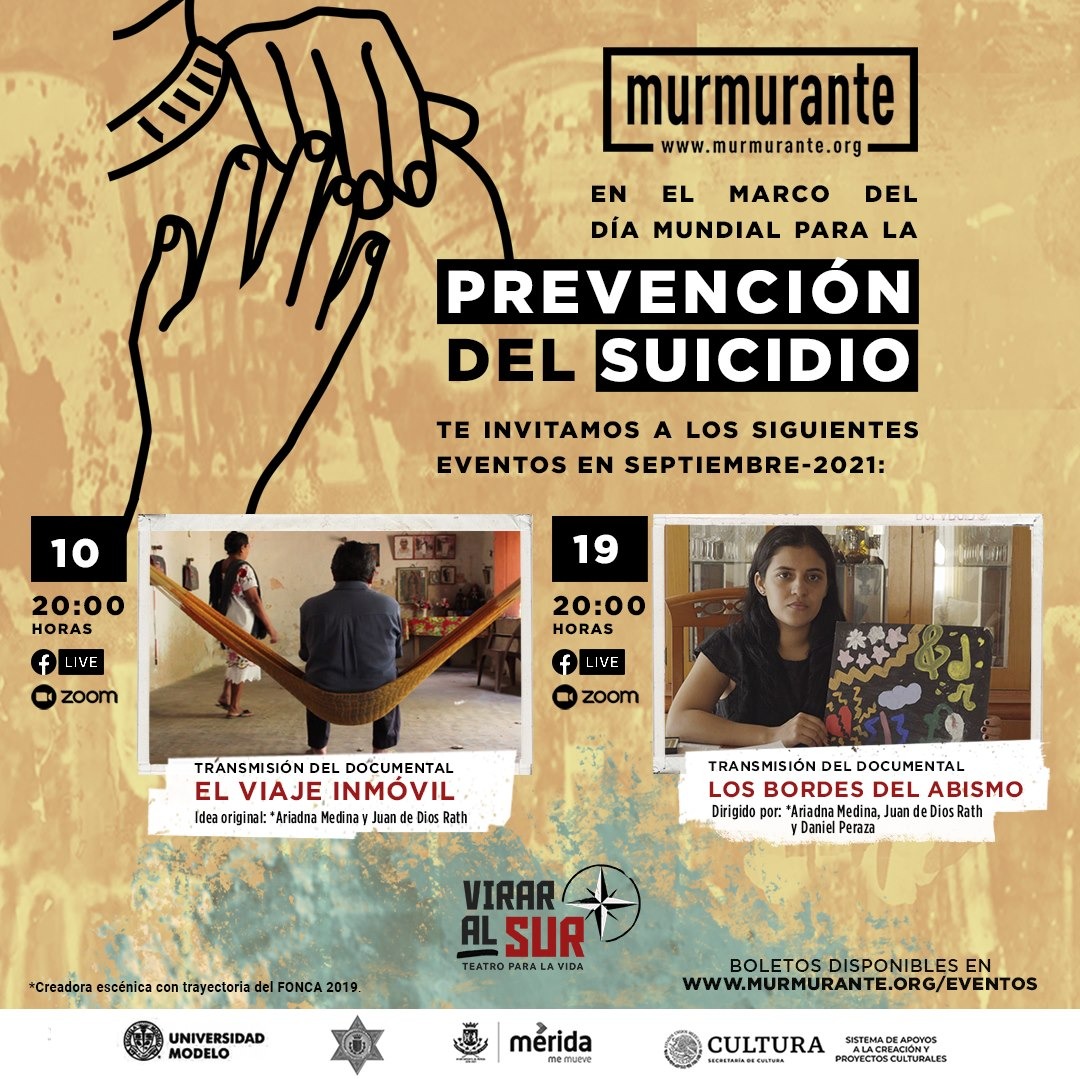 La Secretaria de Cultura del Gobierno de México, a través del Programa de Apoyos a la Creación México en Escena-Grupos Artísticos (MEGA) y Murmurante Producciones A.C., en colaboración con la Policía Municipal, la Dirección de Cultura del H. Ayuntamiento de Mérida, el Instituto Municipal de la Mujer y la Universidad Modelo presentan, en el marco del En el marco del Día Internacional para la Prevención del Suicidio la transmisión de los documentales «El viaje inmóvil» y «Los bordes del abismo», este último reconocido como Mejor Largometraje Documental en el AQP Audiovisual Film Festival de Arequipa Perú 2020.