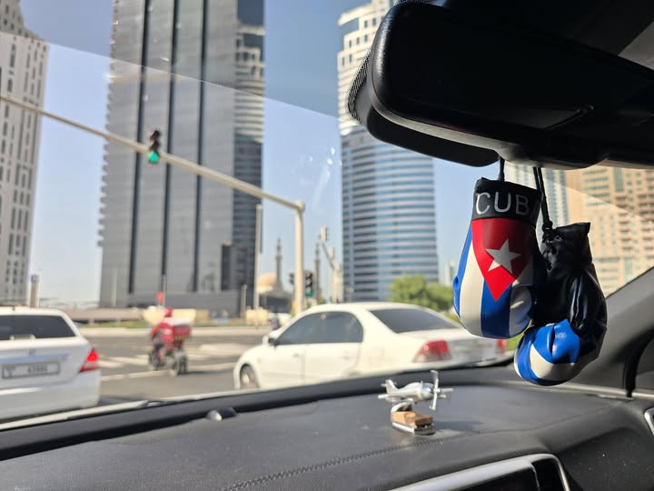 Miré los guantes colgando del retrovisor. La bandera cubana balanceándose suave. Los rascacielos de Dubai reflejándose en el parabrisas.